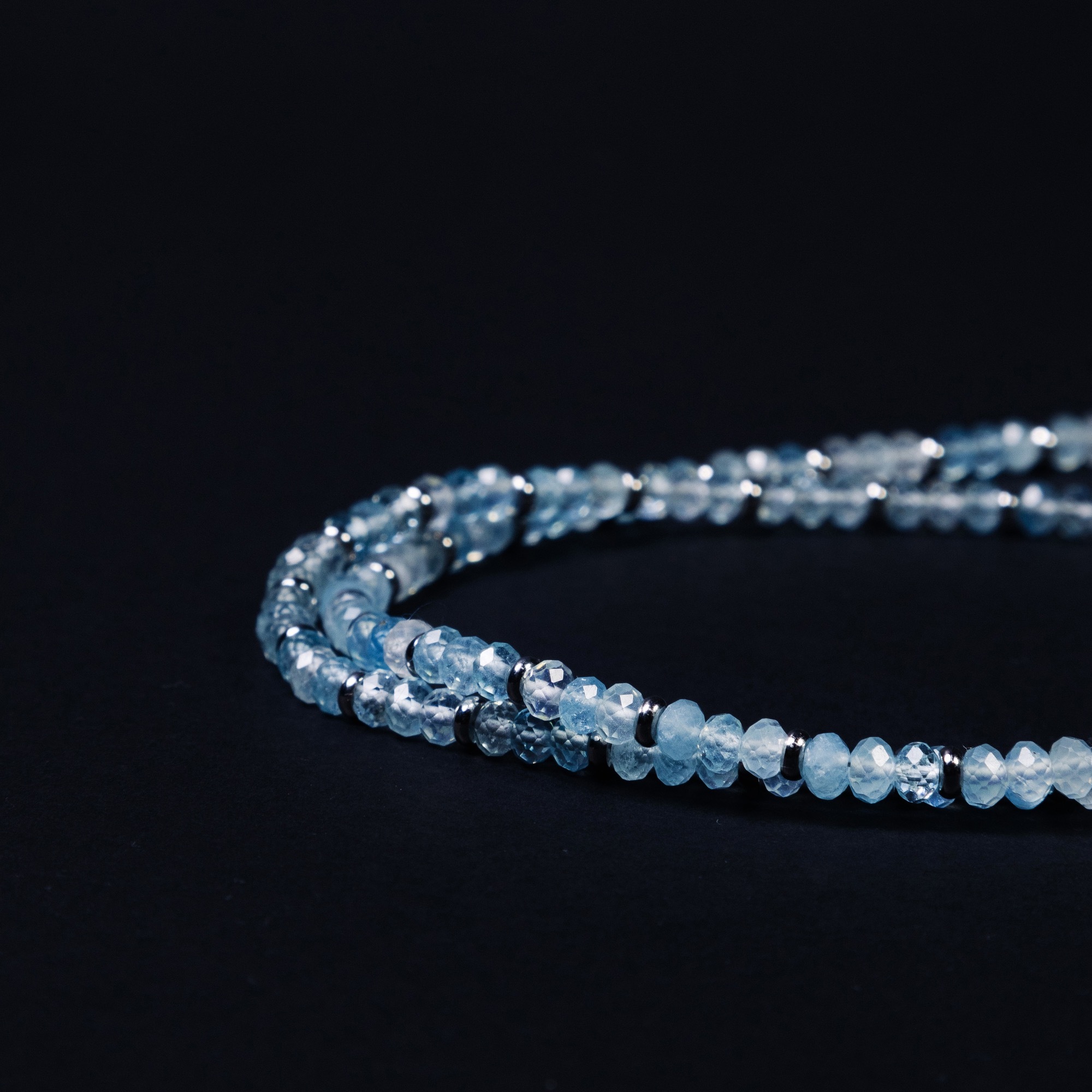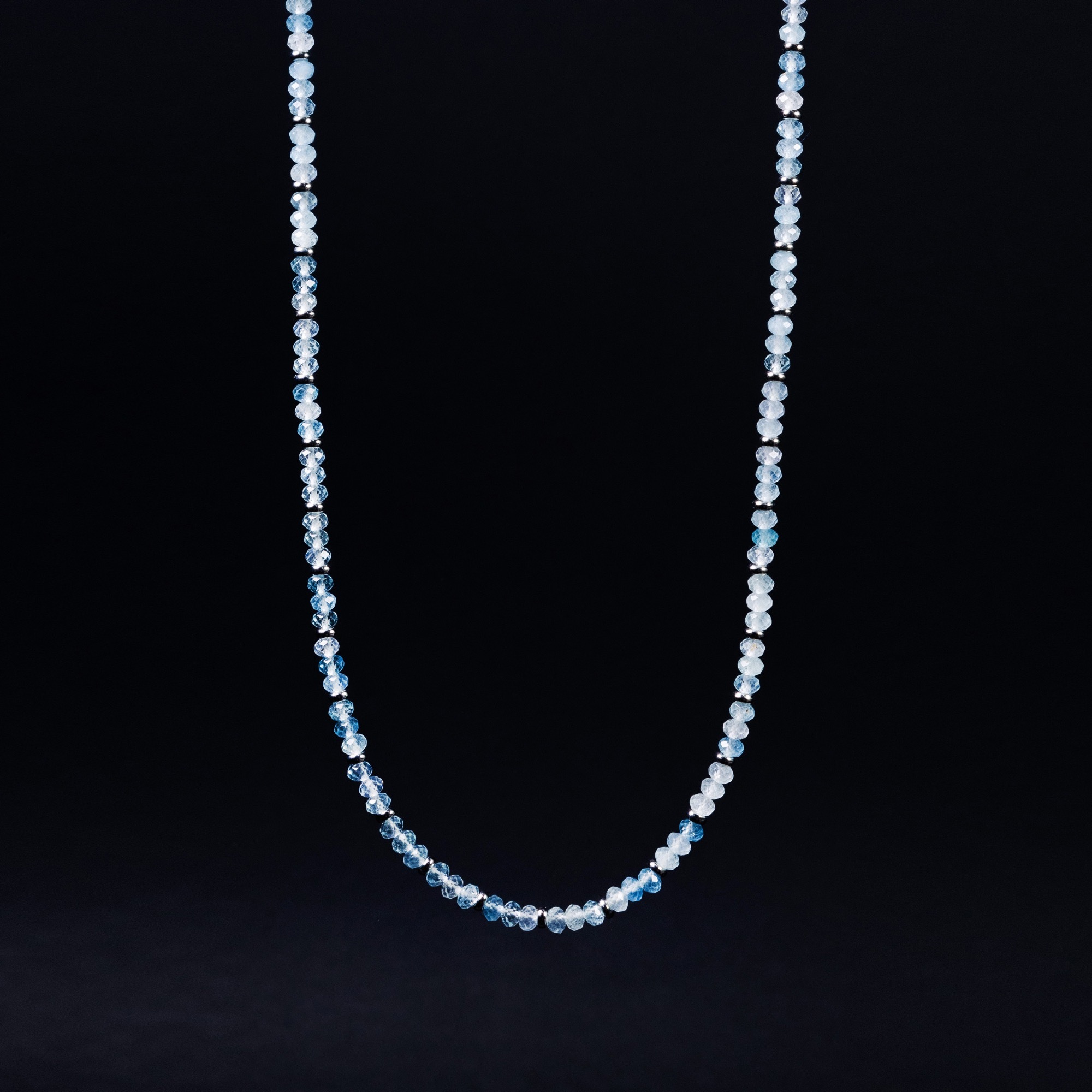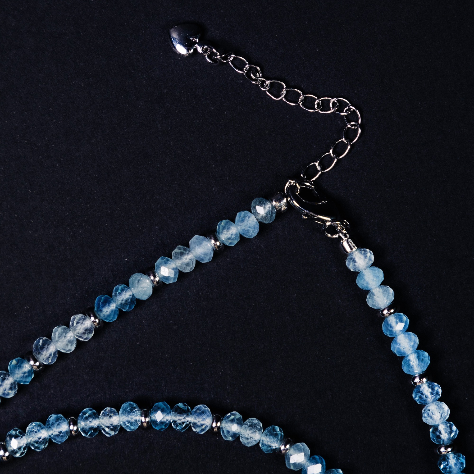 Главным же украшением колье служат множество аквамаринов, великолепно играющих на свету благодаря своему сияющему оттенку и огранке. Длина колье в 60 см делает его универсальным аксессуаром, который легко сочетается как с повседневной, так и с вечерней одеждой. Крепкий карабин обеспечивает надежную и комфортную фиксацию колье на шее.