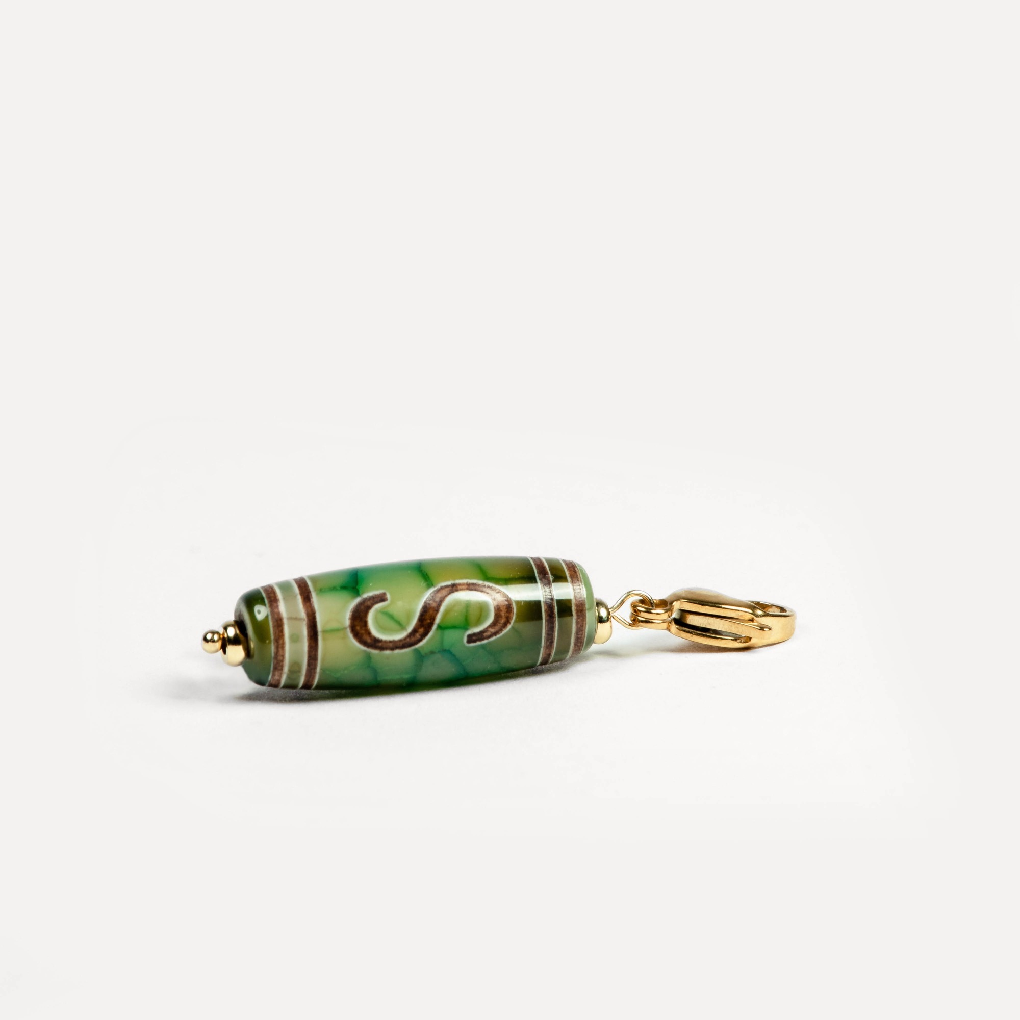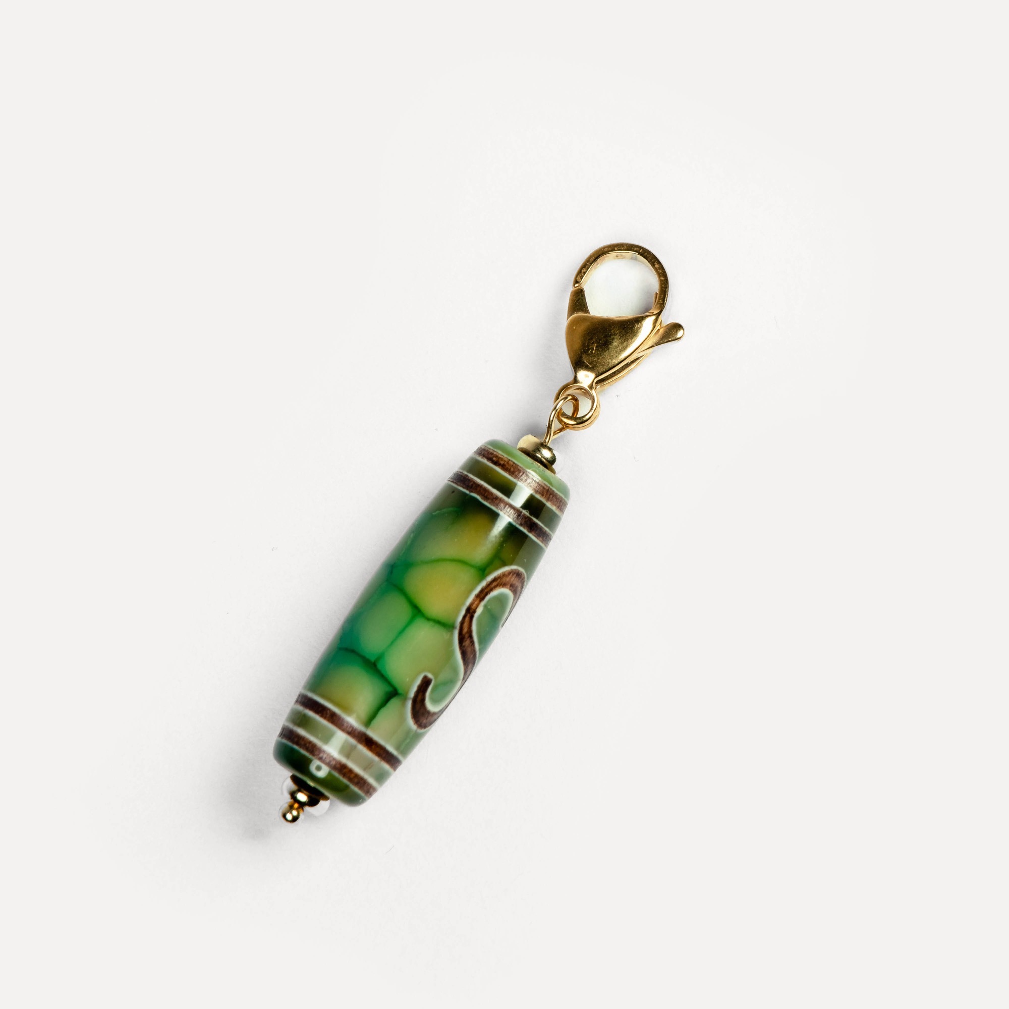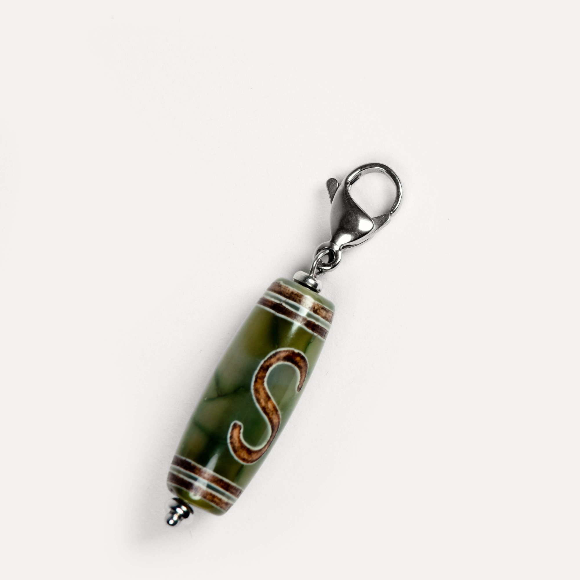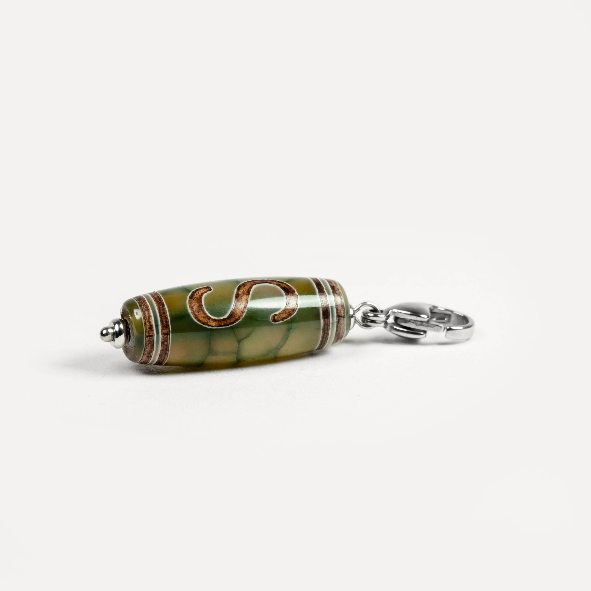 Подвеска Dzi — универсальный аксессуар на карабине, в центре которого — выразительная бусина дзи, выполненная из натурального камня и украшенная традиционным узором, нанесённым методом травления. Такой способ оформления сохраняет символику рисунка и придаёт бусине артефактный характер — как будто она пришла к вам из другого времени. Бусины дзи в коллекции могут быть изготовлены из разных камней: чёрного, белого, зелёного и коричневого агата, а также сердолика. Каждый вариант обладает природной текстурой, а уникальные узоры делают каждую подвеску по‑настоящему особенной. Благодаря удобному карабину подвеску можно легко зафиксировать на цепочке, кожаном шнурке или ленте — и носить как кулон. Также её можно прикрепить к ключам, застёжке сумки, браслету или даже к молнии рюкзака, превращая её в стильный персональный акцент. Dzi — это не просто украшение, а гибкий аксессуар с характером. Он легко подстраивается под ваш стиль и настроение, добавляя образу глубину и индивидуальность.