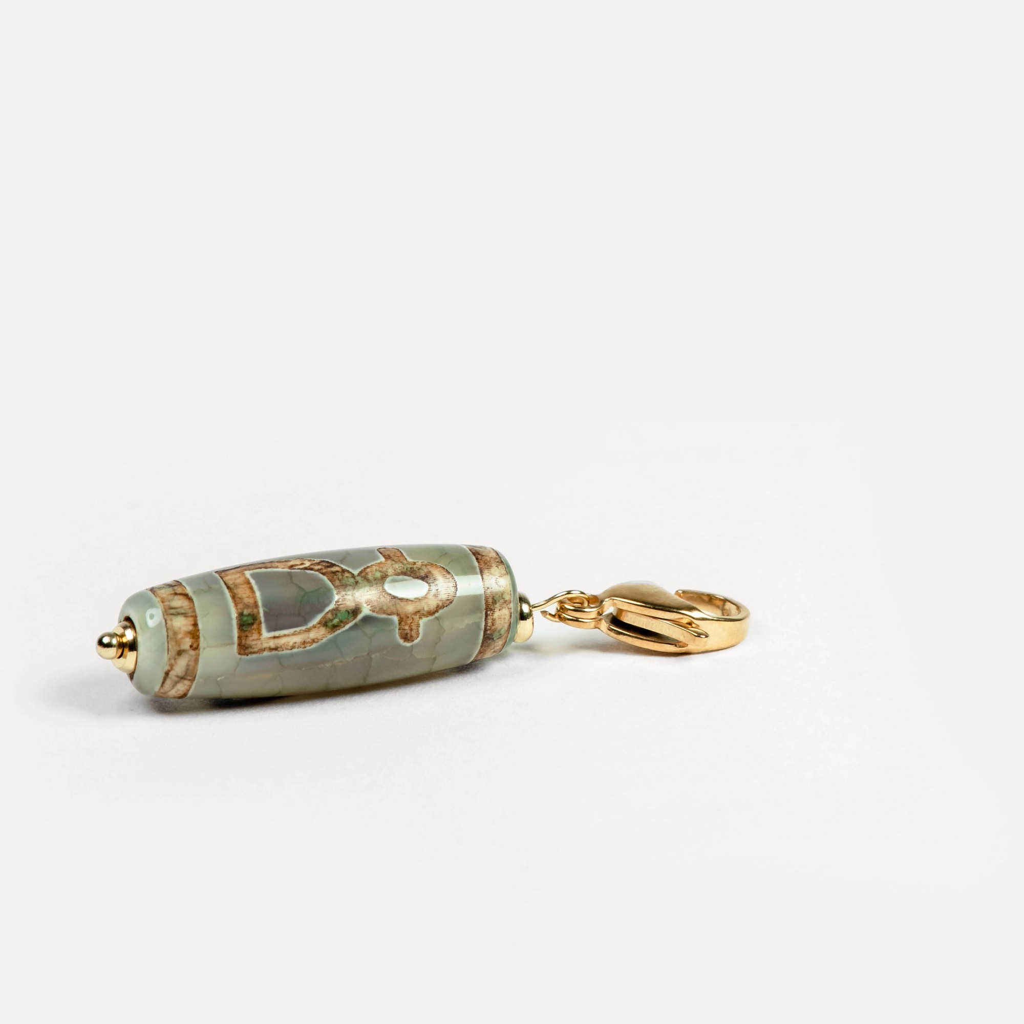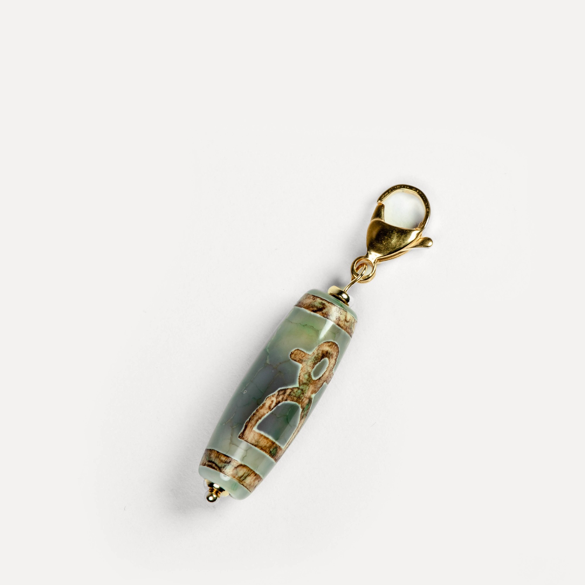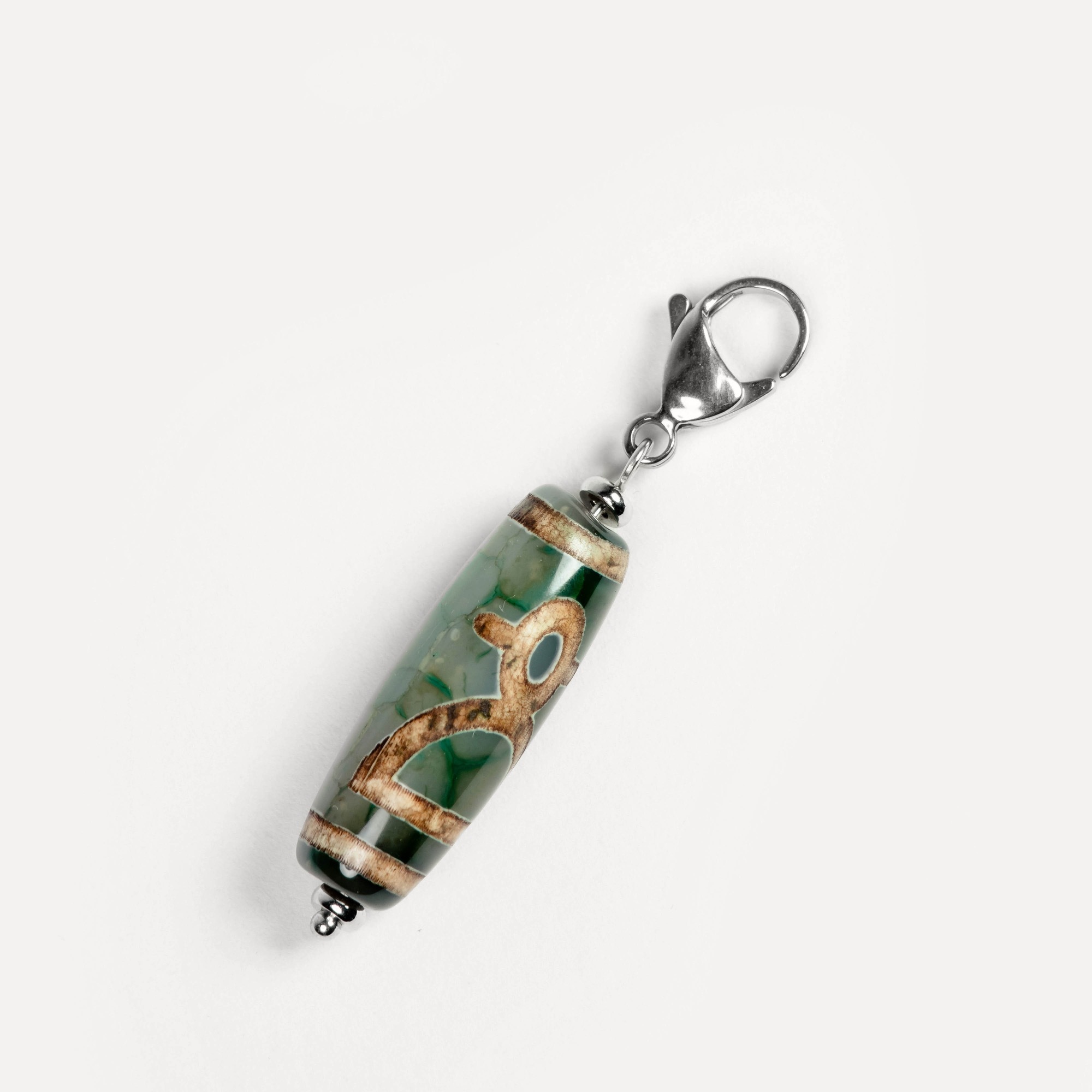 Подвеска Dzi — универсальный аксессуар на карабине, в центре которого — выразительная бусина дзи, выполненная из натурального камня и украшенная традиционным узором, нанесённым методом травления. Такой способ оформления сохраняет символику рисунка и придаёт бусине артефактный характер — как будто она пришла к вам из другого времени. Бусины дзи в коллекции могут быть изготовлены из разных камней: чёрного, белого, зелёного и коричневого агата, а также сердолика. Каждый вариант обладает природной текстурой, а уникальные узоры делают каждую подвеску по‑настоящему особенной. Благодаря удобному карабину подвеску можно легко зафиксировать на цепочке, кожаном шнурке или ленте — и носить как кулон. Также её можно прикрепить к ключам, застёжке сумки, браслету или даже к молнии рюкзака, превращая её в стильный персональный акцент. Dzi — это не просто украшение, а гибкий аксессуар с характером. Он легко подстраивается под ваш стиль и настроение, добавляя образу глубину и индивидуальность.