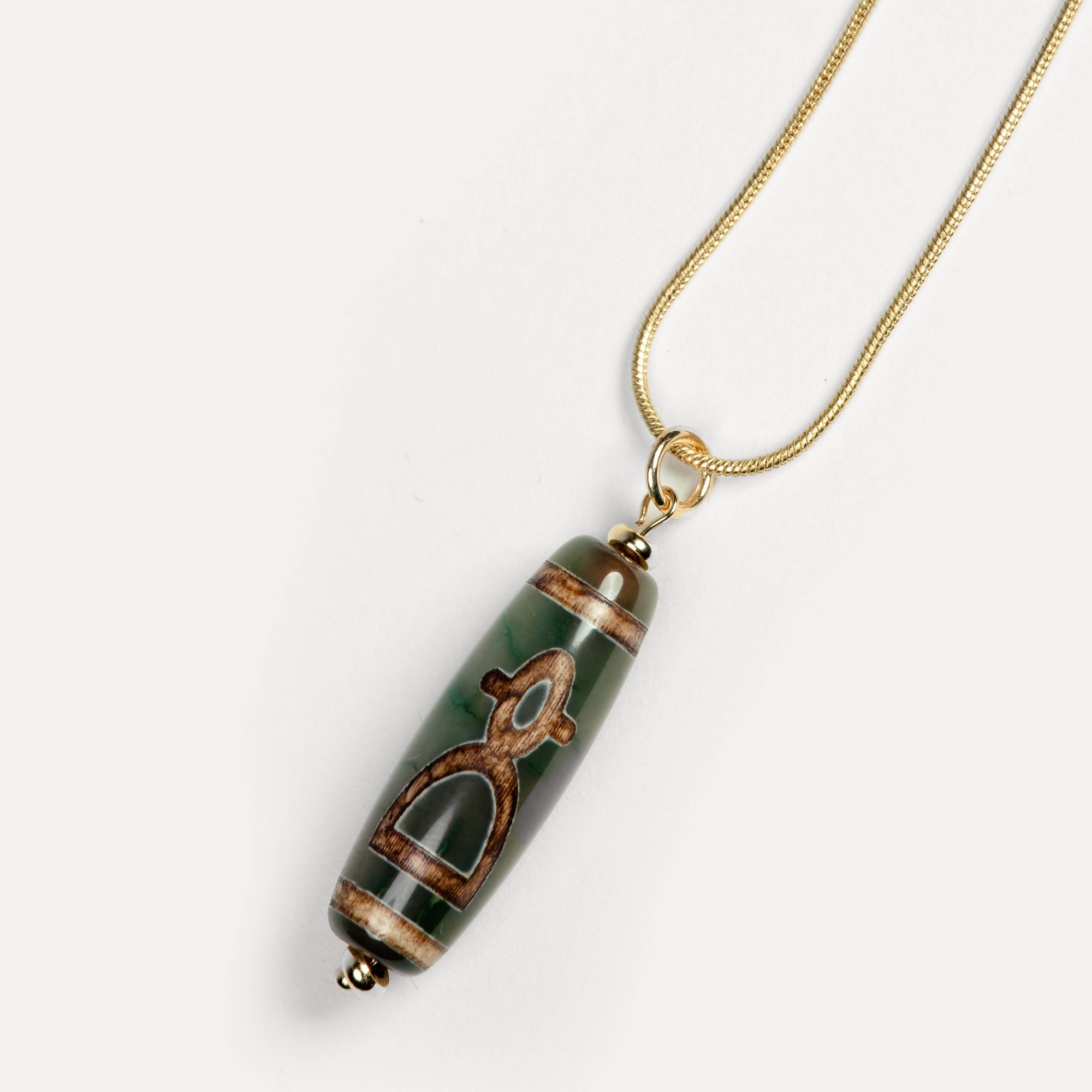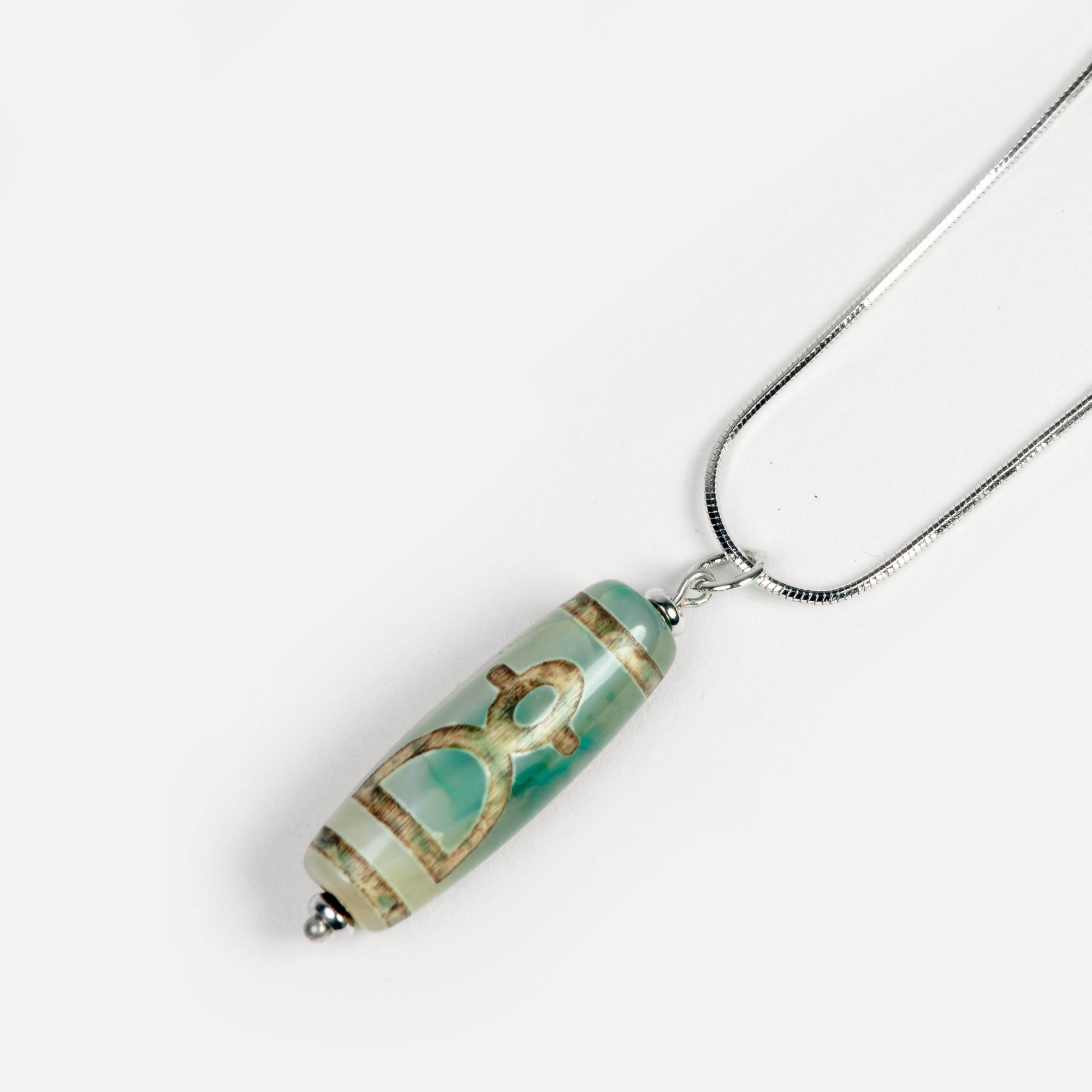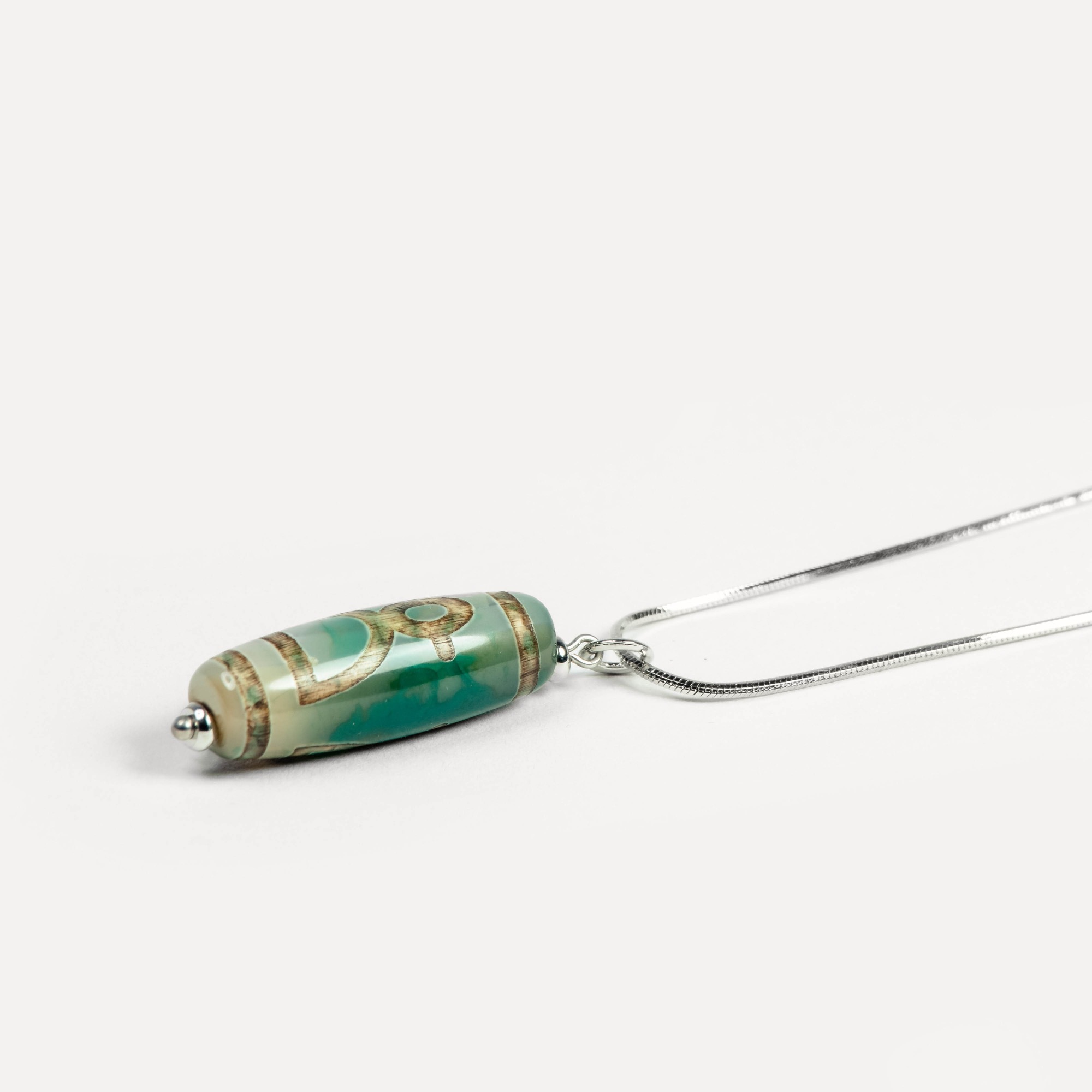Подвеска Dzi — универсальный аксессуар на карабине, в центре которого — выразительная бусина дзи, выполненная из натурального камня и украшенная традиционным узором, нанесённым методом травления. Такой способ оформления сохраняет символику рисунка и придаёт бусине артефактный характер — как будто она пришла к вам из другого времени. Бусины дзи в коллекции могут быть изготовлены из разных камней: чёрного, белого, зелёного и коричневого агата, а также сердолика. Каждый вариант обладает природной текстурой, а уникальные узоры делают каждую подвеску по‑настоящему особенной. Благодаря удобному карабину подвеску можно легко зафиксировать на цепочке, кожаном шнурке или ленте — и носить как кулон. Также её можно прикрепить к ключам, застёжке сумки, браслету или даже к молнии рюкзака, превращая её в стильный персональный акцент. Dzi — это не просто украшение, а гибкий аксессуар с характером. Он легко подстраивается под ваш стиль и настроение, добавляя образу глубину и индивидуальность.