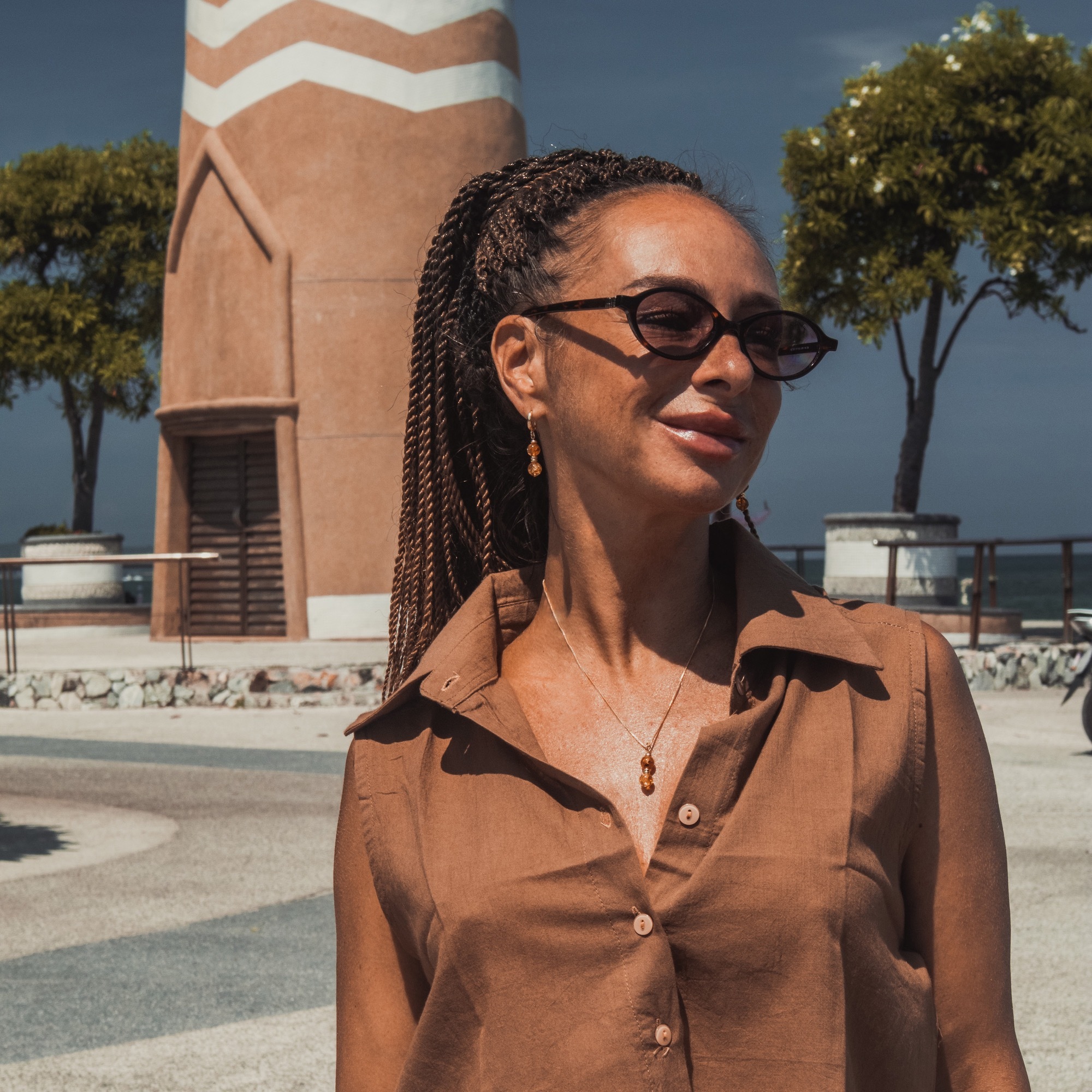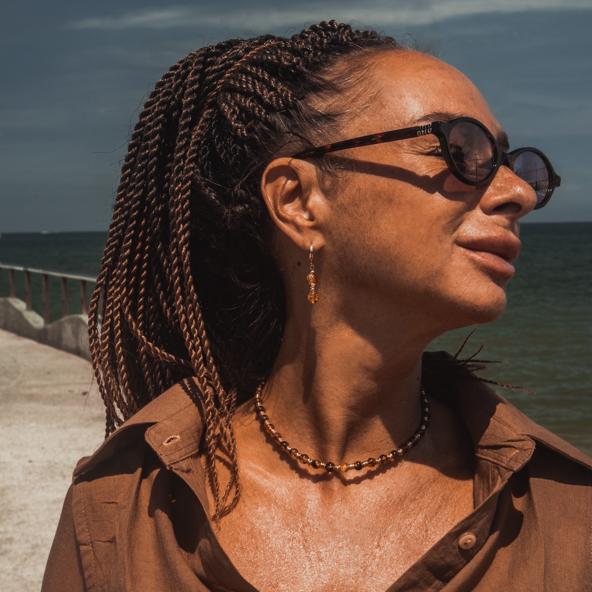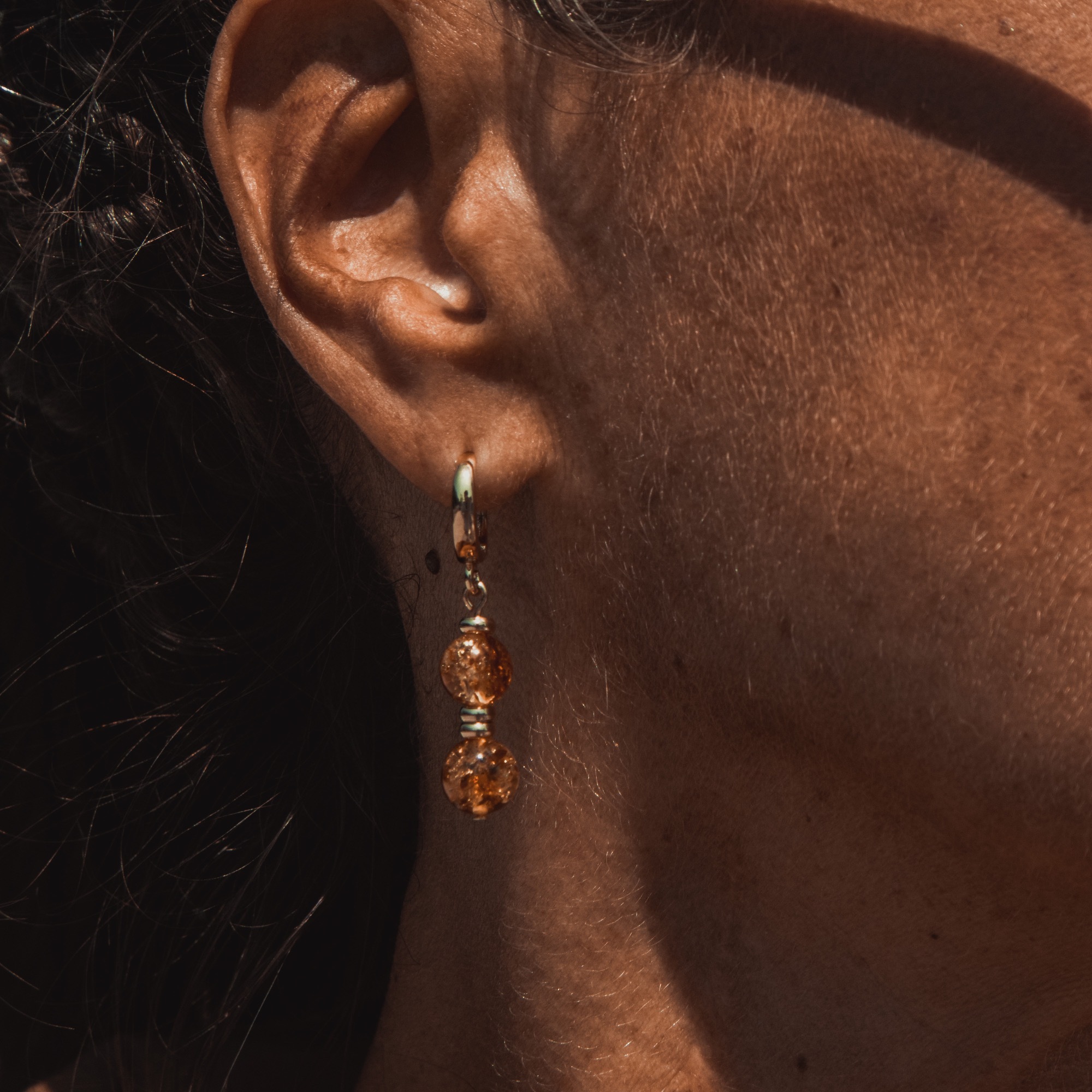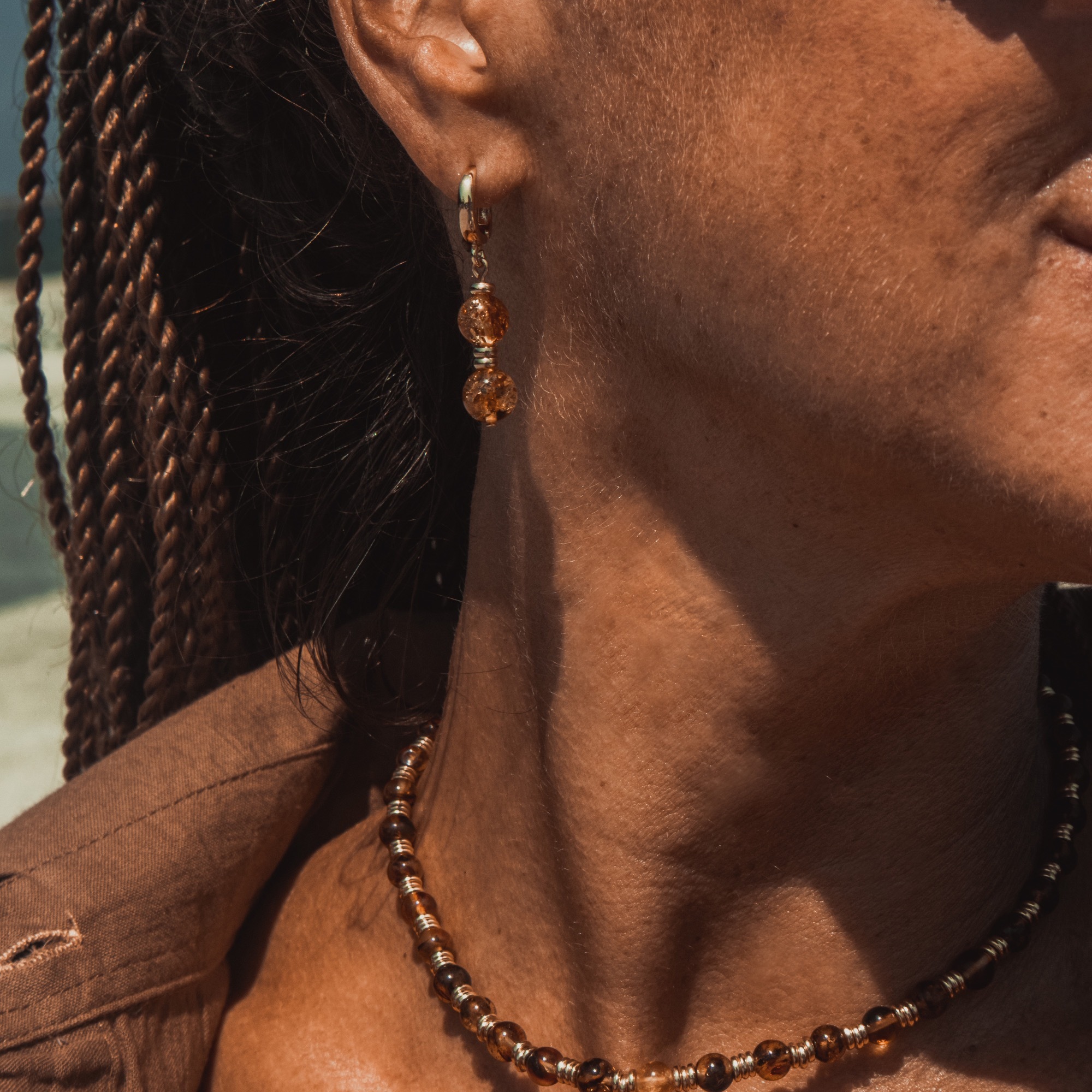 Серьги Purex — это изящное продолжение одноимённого чокера, воплощающее ту же эстетику натуральных камней и утончённого ритма. Каждая серьга состоит из пары бусин, разделённых двумя изысканными проставками из бижутерного сплава, что придаёт композиции ритмичность и лёгкость.